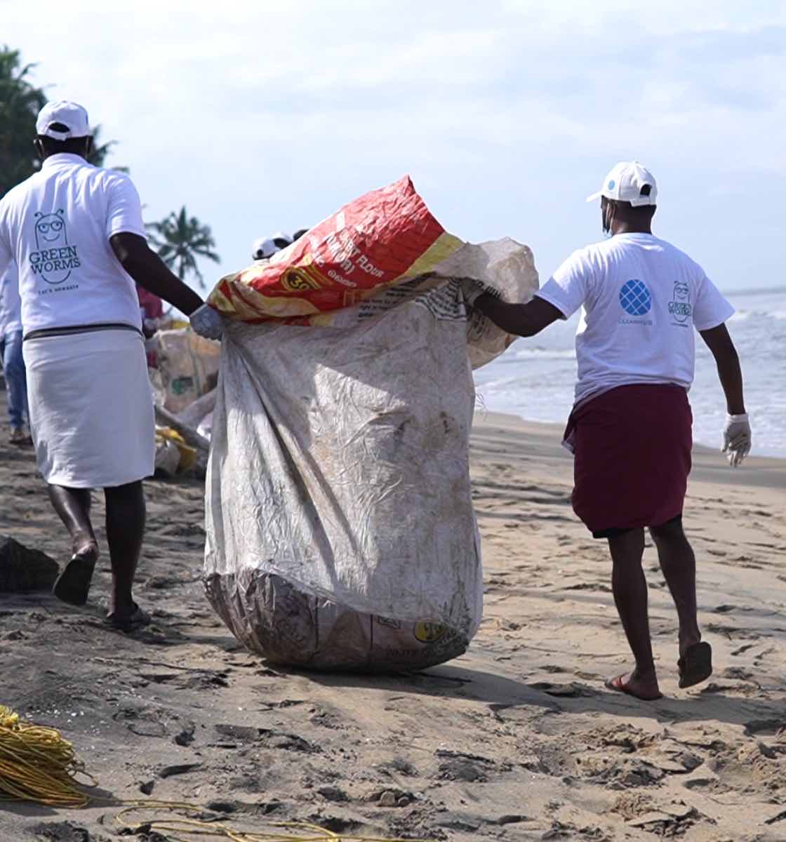 Regenwasser, Wind und Überschwemmungen tragen Plastikmüll vom Land in die Meere. Wir haben uns mit CleanHub zusammengeschlossen, um Plastik abzufangen, bevor es das wertvollste Ökosystem der Erde erreicht. Hierfür unterstützen wir seit 2020 das Recyclingprojekt "Green Worms Waste Management" in Südindien, bei welchem die Sammlung und Verwertung von Plastikabfällen in Küstenregionen organisiert wird.