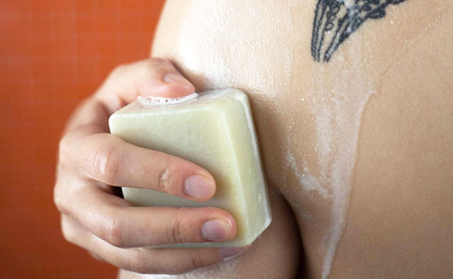 Herkömmliches Duschgel wird in flüssiger Form in Plastikflaschen abgefüllt und verkauft. Das verursacht unnötigen Verpackungsmüll und höhere Emissionen beim Transport, denn der Wasseranteil (~75%) muss jedes Mal mit transportiert werden.